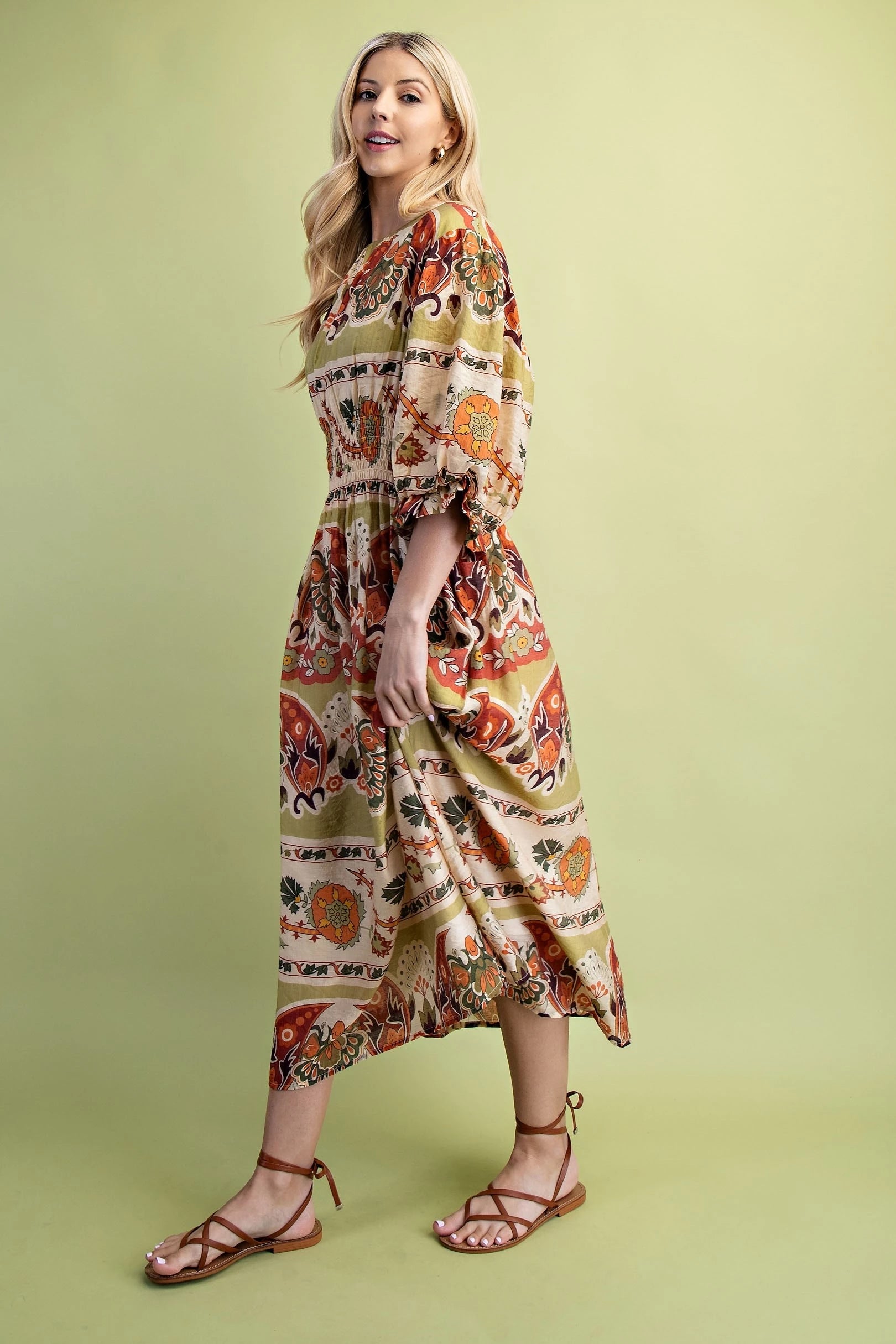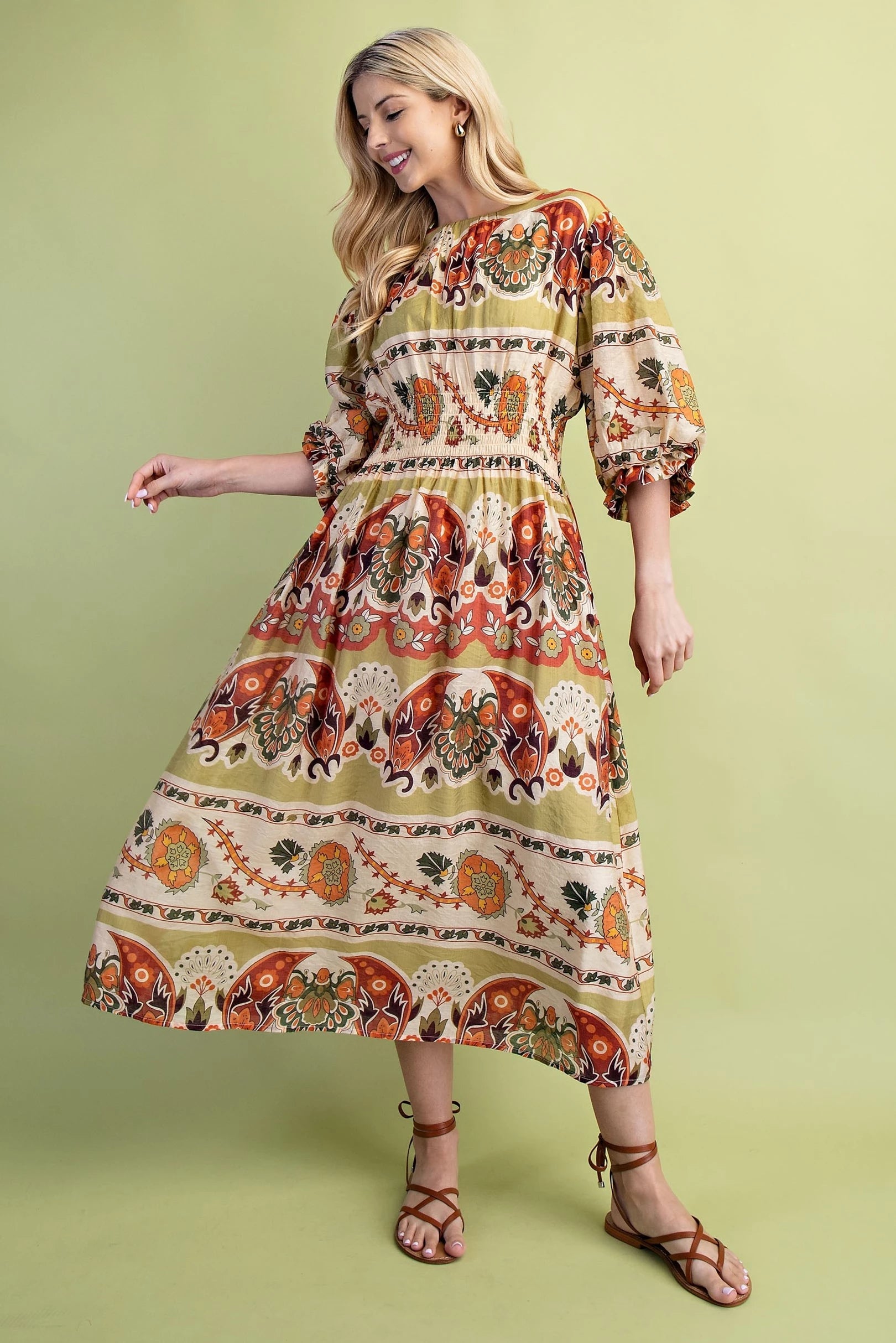 Make a statement with this captivating printed midi dress designed for the modern woman who values both elegance and comfort. The strategically placed smocked waist defines your figure while the voluminous 3/4 balloon sleeves add dimension and sophistication. The premium rayon-polyester blend offers a luxurious feel against your skin with excellent drape and durability. Whether you're heading to the office, a special occasion, or a casual gathering, this versatile piece adapts to any setting. The intricate print and thoughtful construction details make this dress a wardrobe essential that delivers style without compromise.