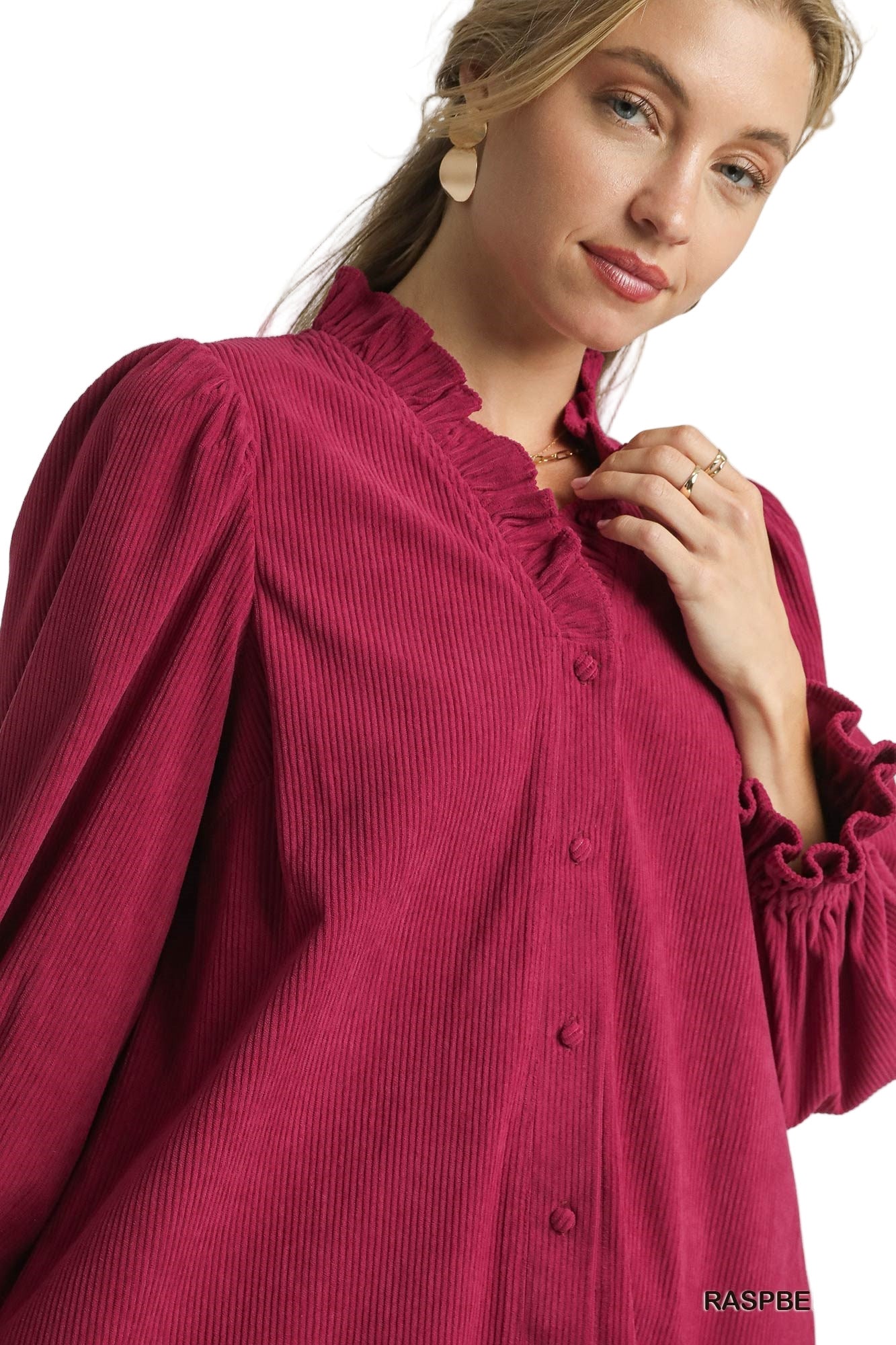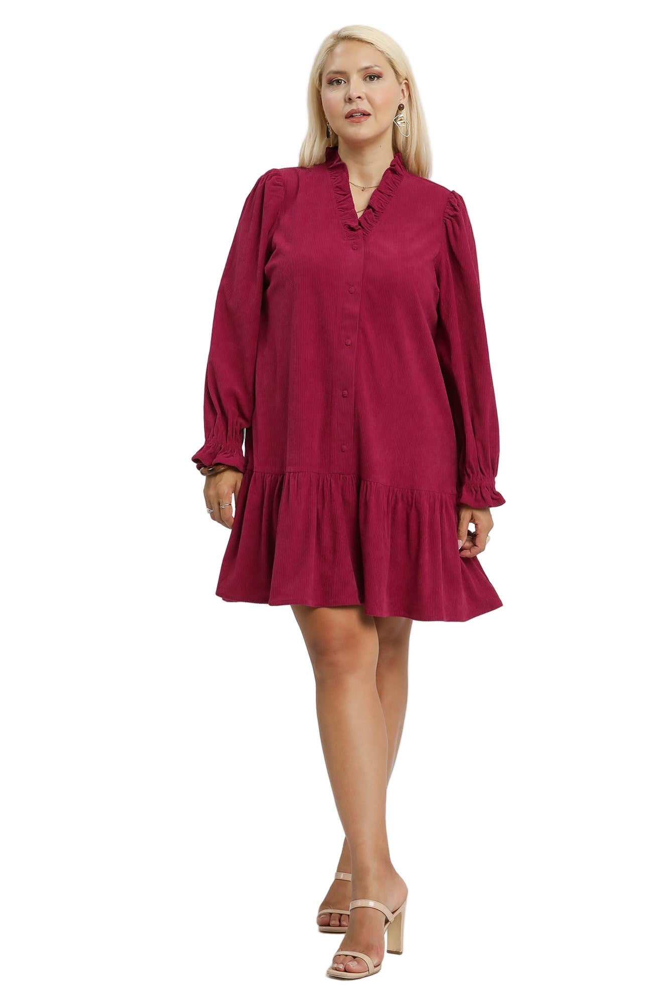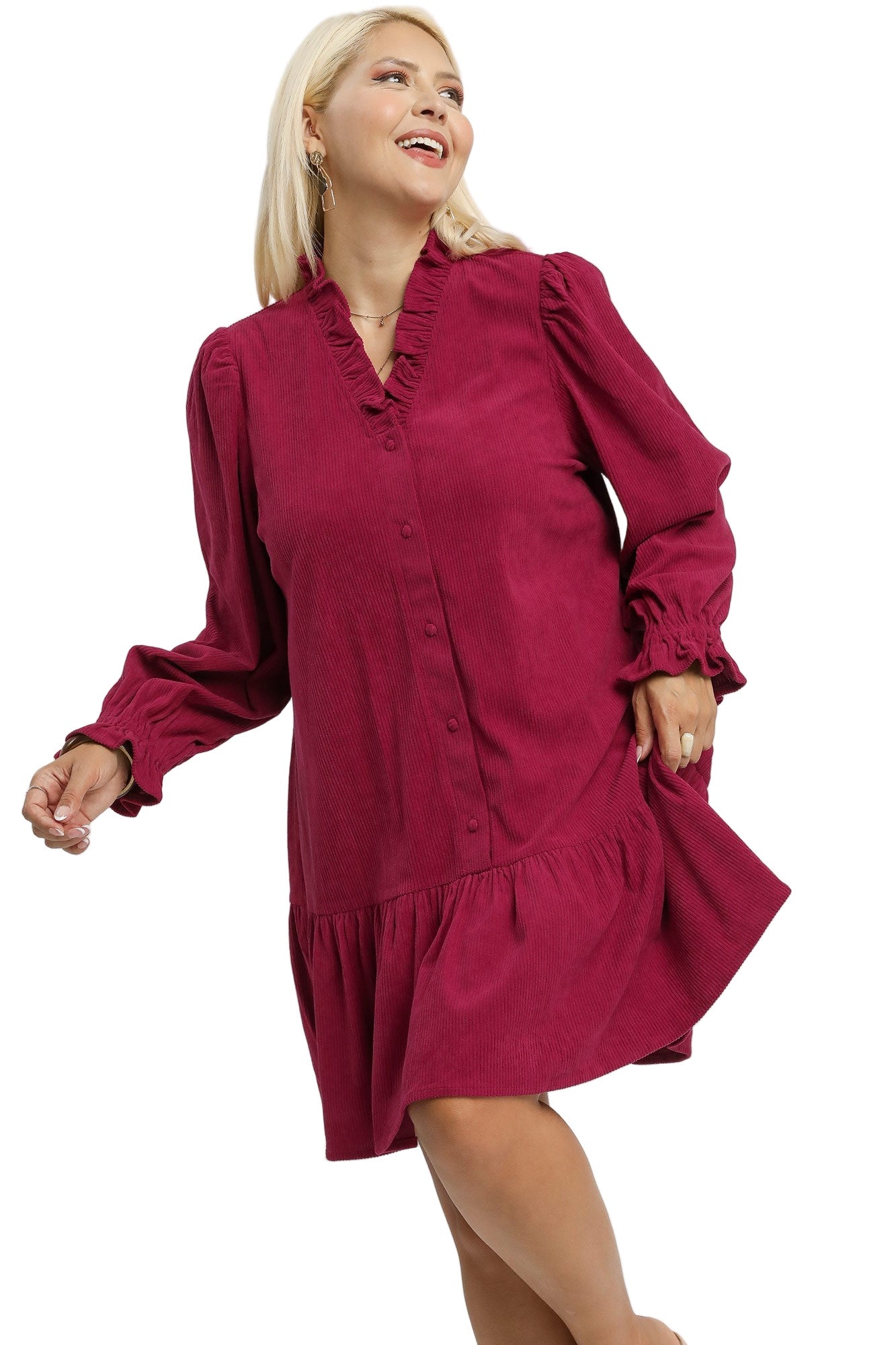 This corduroy babydoll dress features a charming ruffle-trimmed V-neckline and a flowing tiered silhouette that flatters every figure. Crafted from soft, stretchy fabric with 95% polyester and 5% spandex, it offers comfortable wear all day long. The long sleeves end in smocked ruffle cuffs, adding a delicate, feminine touch. Lightweight and unlined, this dress is perfect for layering or wearing on its own, making it a versatile addition to your wardrobe.