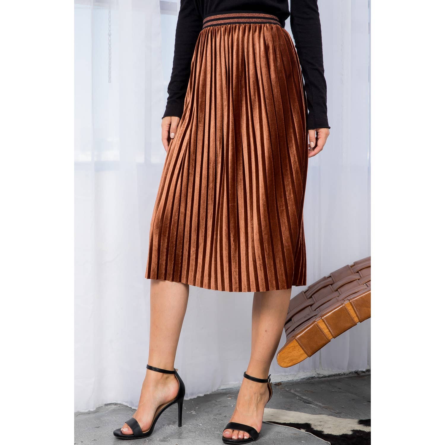 Elevate your seasonal style with this exquisite velvet skirt, crafted in a rich chocolate hue that complements any complexion. The thoughtfully designed pleats offer graceful movement, while the comfortable elastic waistband ensures all-day wearability. Available in sizes XS to L, this versatile piece transitions seamlessly from holiday gatherings to everyday elegance, making it an essential addition to your closet.
